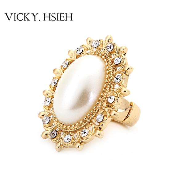 VICKY.HSIEH Rhodium Tone Crystal Rhinestone Pave Lace Stretch Statement Rings with Cream Stone